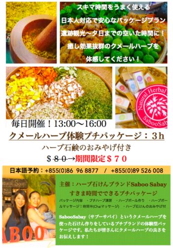 クメールハーブ押しのサブーサバイが日本人旅行者の皆様にクメールハーブを体感してほしい!!そんな思いで作った現地体験パッケージプランのご案内です。 スキマ時間によって選べるプラン3種類 ①プチハーブプラン ②満足ハーブプラン ③贅沢ハーブプラン 今回…
